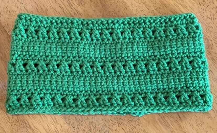 | Materials Worsted weight (4) yarn Yardage: 75-100 yards 6 mm or any hook needed to obtain gauge Scissors Needle Pattern Notes Advanced Beginner Written in US crochet terms Finished Size: 21″ Circumference; Flat Lay 10.5″ wide and 5″ tall Gauge: 4×4 = 14 sts and rows 1-10 Abbreviations Stitch/stitches (st/sts) Chain (ch) Single crochet (SC) Double crochet (DC) Round(s) (rds) Foundation Single Crochet (FSC) Before You Start Pattern is crocheted in the round and is worked from bottom up. Ch 1 does not count as a stitch. Ch 3 does count as a stitch. |