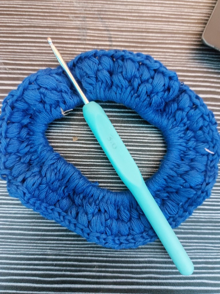 Round 1: Working around the elastic, ch 2, (dc cluster, ch 1), repeat 21 times around, join. (21 dc clusters/21 ch)