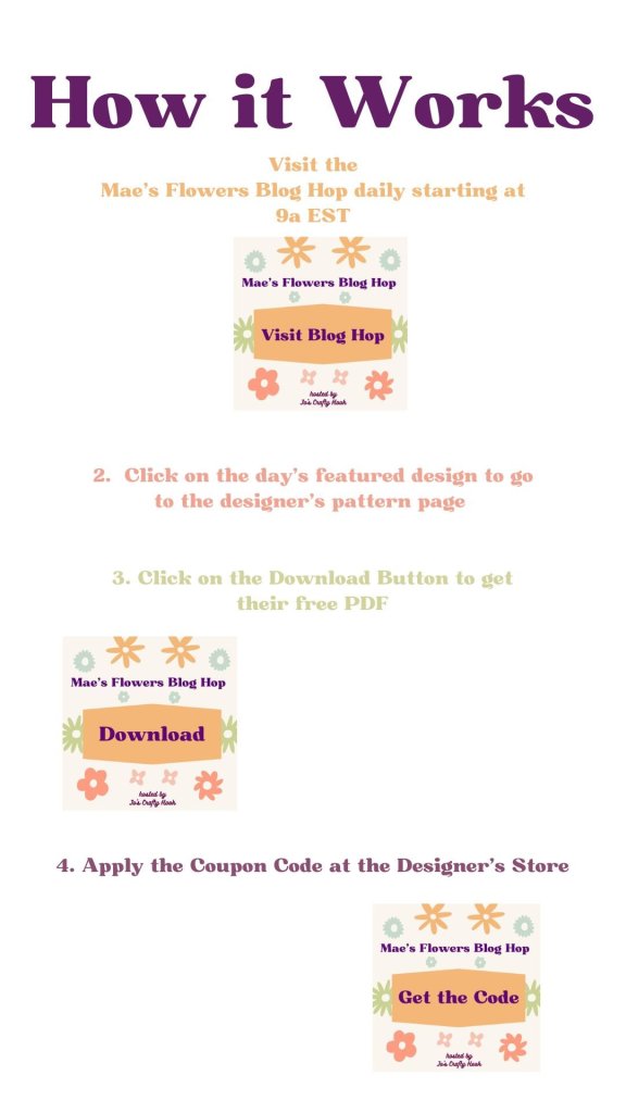 Mae’s Flowers Blog Hop features some fun flower themed crochet patterns and will run from May 1st-18th! Each pattern will be free for 24 hours only and there is not a bundle sale with this hop which means after the 24 hours the coupon code will expire.