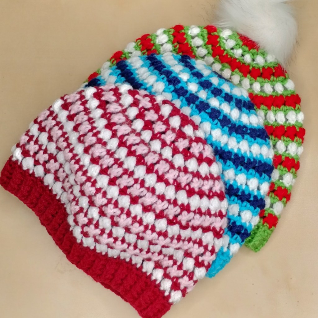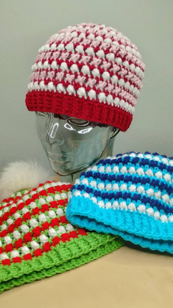 The Rosa Beanie is an easy advanced beginner repeating pattern that can be made in child or adult size and can be customized to be snug or slouchy. I created this pattern because I loved how the reverse side of the hdc cluster resembled pink ribbons and the puffs were like little kisses of snow throughout.