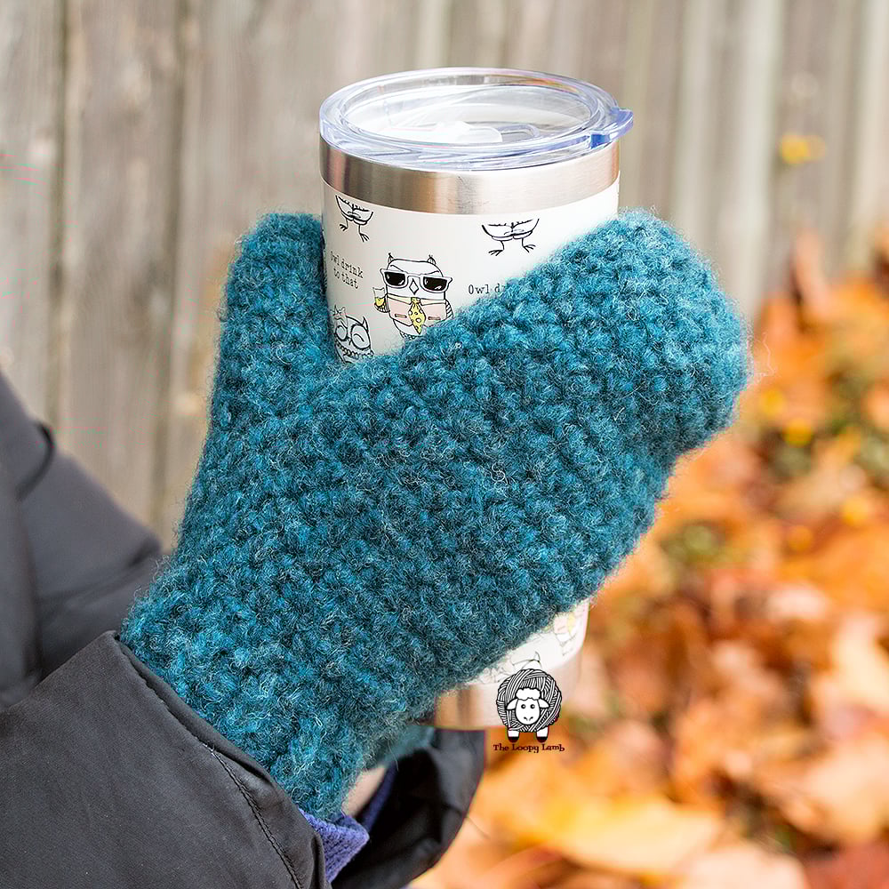 Mitts are worked in spiraling rows, using front post stitches creating a lovely texture to these cozy mittens.