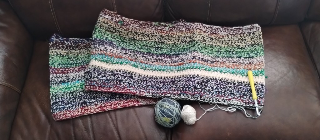 Another fun scrappy project that I have started is a scrappy blanket. I’m making it with simple crochet stitches. It will be the perfect size for cuddling under while watching a movie.