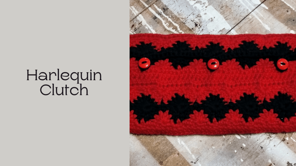 The Harlequin Clutch is a fun crochet project that can be made in any two #4 worsted weight yarns. My Harlequin Clutch is by Lego’s Harley Quinn. It can hold a small tablet or gaming device and is the perfect gift for your fellow geek or gamer.